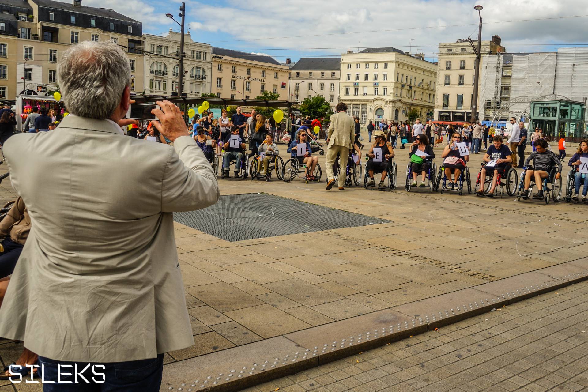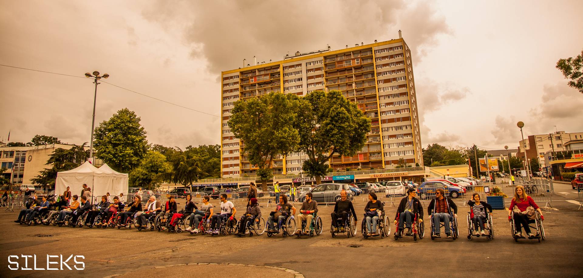 Une expérience d’urbanisme, une performance faisant appel à la participation du public qui, installé sur des fauteuils roulants, se transforme en une sorte de peloton d’exécution, en une joyeuse machine de guerre.