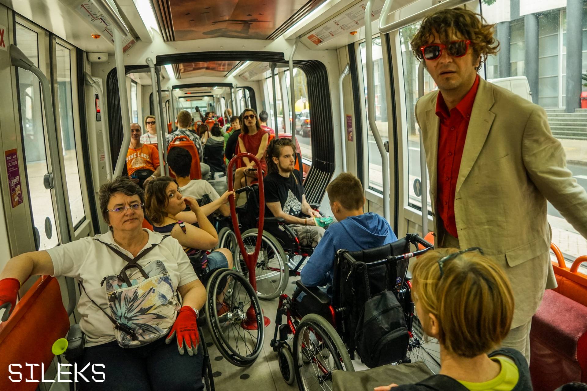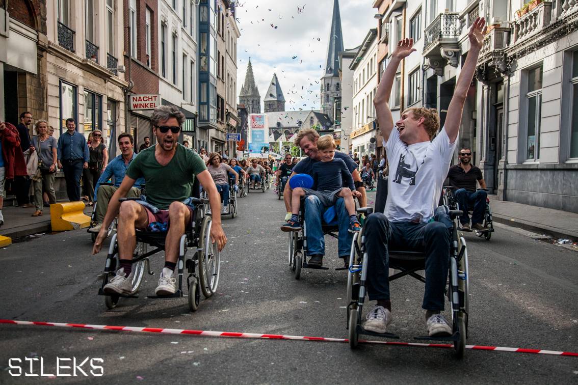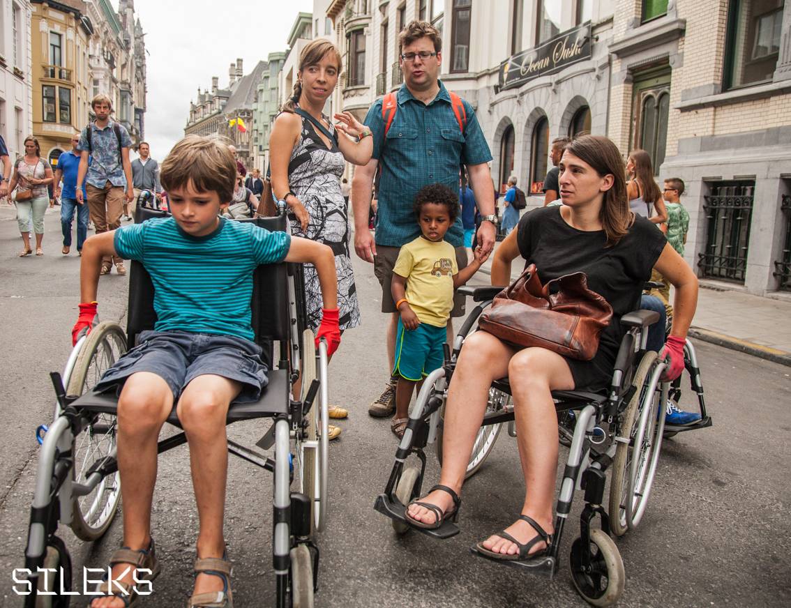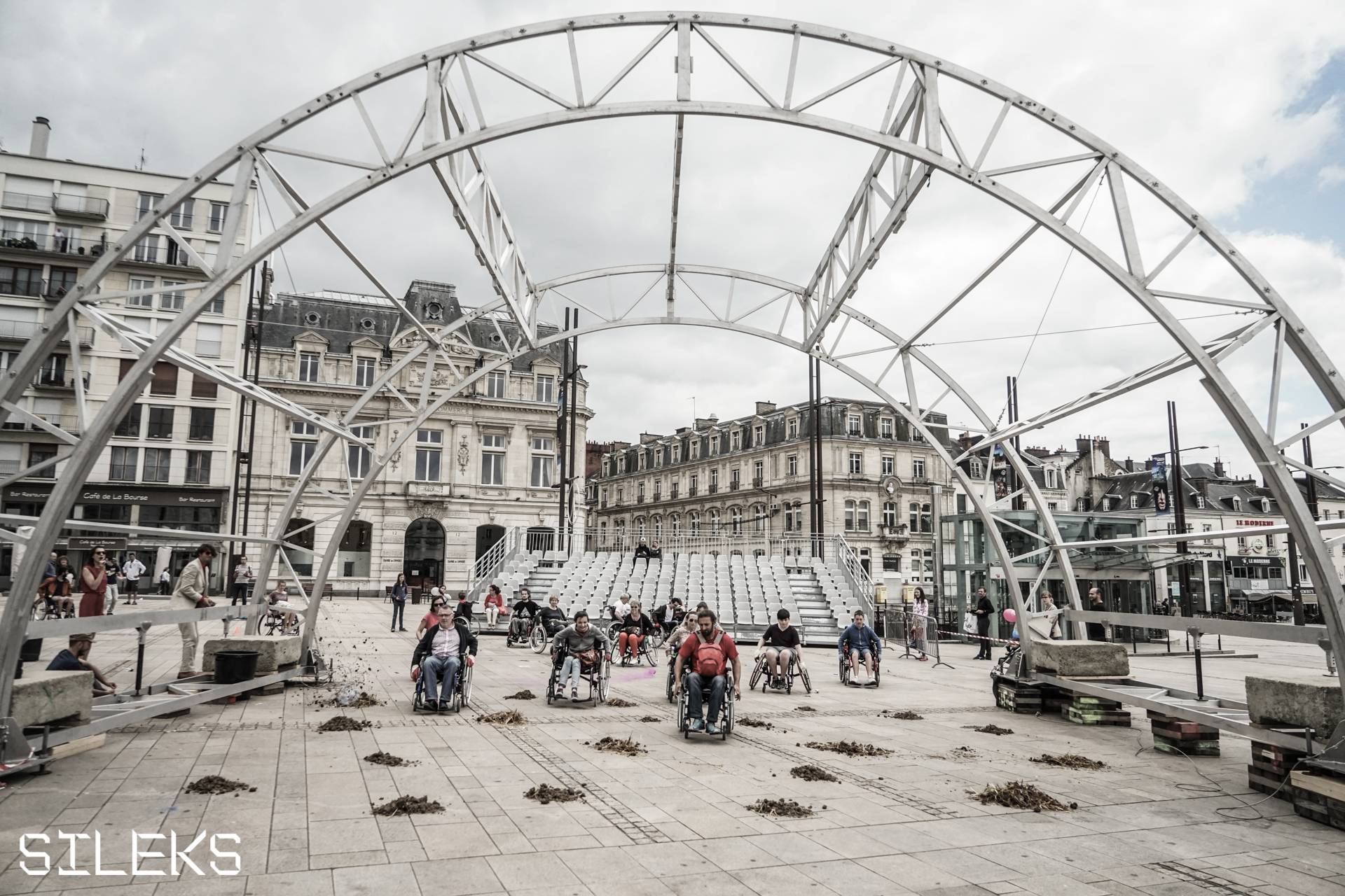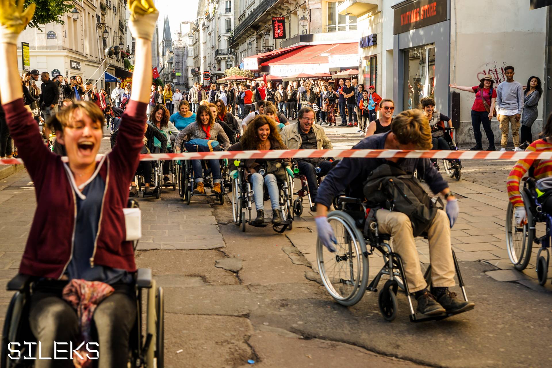 Une expérience d’urbanisme, une performance faisant appel à la participation du public qui, installé sur des fauteuils roulants, se transforme en une sorte de peloton d’exécution, en une joyeuse machine de guerre.