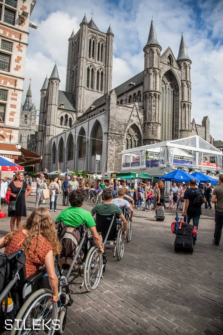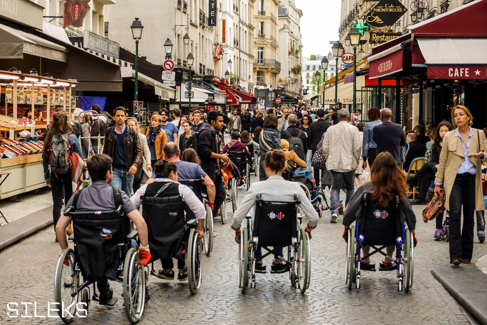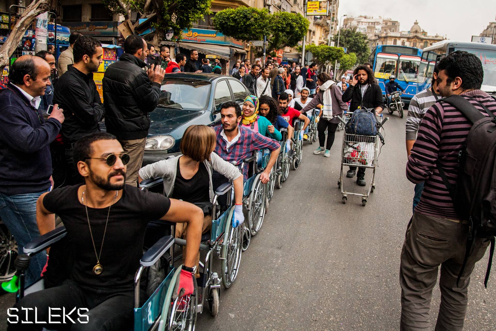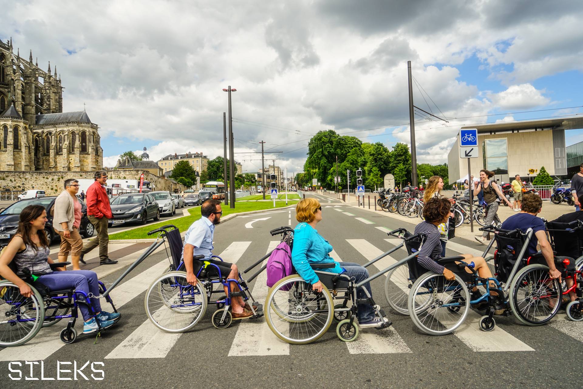 Une expérience d’urbanisme, une performance faisant appel à la participation du public qui, installé sur des fauteuils roulants, se transforme en une sorte de peloton d’exécution, en une joyeuse machine de guerre.