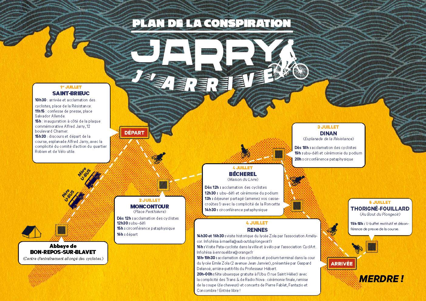 Alfred Jarry , poète et inventeur de la science pataphysique, était un pratiquant fanatique de la bicyclette. Aussi pour marcher dans ses pas, lui rendre hommage et retrouver le goût de son oeuvre, nous nous proposons d'organiser une course cycliste sur les routes de sa jeunesse, 150 ans après sa naissance, en juillet 2023. Le départ sera donné de la place Alfred Jarry à Saint Brieuc et le parcours se terminera à Rennes. Les 34 concurrents devront s'arrêter toutes les deux heures dans les villages étapes afin de rivaliser lors d'épreuves de pataphysique.